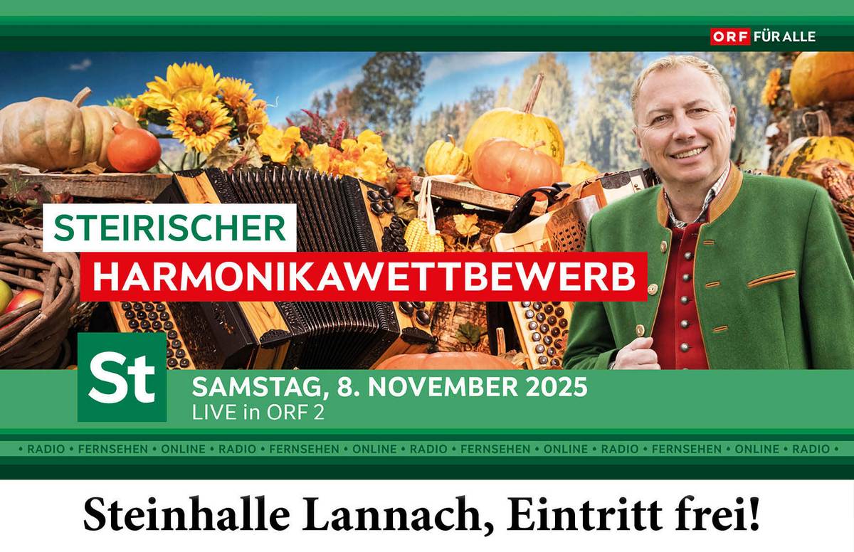 Aikido ist unsere Therapie Durch den Krieg gefährdete ukrainische Jugendliche in der Steiermark Tragischer Unfall auf der Mur: Ein Arbeiter tot geborgen VS Leopoldinum Graz: Vorreiter in Österreich Erste öffentliche International Baccalaureate-Volksschule Tag der Offenen Tür am kommenden Freitag, 10. Oktober 2025 33 Kilometer-Tunnel ist das Herzstück Koralmbahn verändert Lebensrealität der Menschen Sparschiene ab 9,90 Euro. Jetzt heißt es schnell sein: noch gibt's Tickets für erste Fahrten. Leutschach hat größte Weintraube der Welt „9 Plätze – 9 Schätze“: Der Eorykogel geht für die Steiermark ins Rennen „Dein Pfand macht satt“ Uniklinikum und Saubermacher starten Spendenaktion für das Marienstüberl Graz Der lautlose Tod Einsatztraining mit echten Kampfstoffen Tierische Nachhilfe: Hund, Katz und Ziege „verstehen“ Zum Welttierschutztag am 4. Oktober 6.000 Haushalte und 100 Schafe „profitieren“ davon 20 Hektar große „Sonnenstrom-Insel“ der Energie Steiermark in Dobl-Zwaring Sibylle Reuter gewinnt SCHREIBEREI Literaturpreis – und erzählt vom Loslassen Mutter warf Neugeborenes auf Carport-Dach Klimaschutz im Rampenlicht TRIGOS Steiermark: Erfolg für „Circular WM Konzept“ von Saubermacher Letzte Chance zum Kutsch’n schaun STEIERMARK SCHAU im Schloss Eggenberg: Goldener Wagen nur noch bis Sonntag in Graz Steirischer Anlagenbauer und Umwelttechnikspezialist Binder+Co Trotz Kostendruck: Bekenntnis zum steirischen Standort Tiefer Brunnen der Vergangenheit Gedenkakt Land Steiermark: 80 Jahre Zweite Republik, 70 Jahre Neutralität – Meilensteine! AREA Süd ins internationale Schaufenster stellen Weststeiermark: Nächtlicher Bombenalarm durch Handy Warnende App in einer ukrainischen Gästegruppe in St. Josef als Auslöser „Für uns ist jeder ein Sieger, der dabei war“ Ein filmischer Rückblick des härtesten Triathlon Österreichs Bonjour, Paris – hier kommt die Steirerin Christa Franz! Haute Couture aus der grünen Mark auf Laufstegen der Pariser Fashionweek Anschluss gesichert! Verkehrsverbund Steiermark gewinnt VCÖ-Mobilitätspreis 2025 Geschäftsführer von 58 Firmen Wie geht das? AK deckt Millionen-Sozialbetrug mit Scheinfirmen auf 50.000 junge Steirer haben ihr Talent gecheckt Steirer in Höchstform: 4. Weltmeister-Titel in Folge Angelino Zeller bei Kletter-WM in Seoul. Chance auf Olympia-Gold gibt’s erst 2032. Smart Production als Jobmotor 1.200 offene Stellen im steirischen Automatisierungscluster Vor 40 Jahren erdacht – ab Dezember Wirklichkeit Journalisten schlugen beim 18. Gösser-Medienturnier am GC Murhof ab Der Winter beginnt am 2. Oktober … mit Kunsteisplatz und Ski-Simulator auf der Grazer Herbstmesse Eine Wurstsemmel „kostet“ heute 4 Liter Milch Vor 30 Jahren war es umgekehrt. Ein Kommentar von Josef Kaltenegger: "EU treibt Bauern in den Ruin" Neuer Mega-Baumarkt in Graz schafft 110 Jobs Hornbach setzt Wachstumskurs fort. Spatenstich für dritten Standort in der Steiermark Als politisches „Hochamt“ inszeniert SPÖ-Parteitag in Premstätten: Max Lercher mit 90 Prozent zum Hoffnungsträger gewählt 7 Regionen, die schon einmal zusammen gelebt haben Graz im Zeichen der sanften Mobilität Bewegter Hauptplatz und Fußverkehrsgipfel im Congress „Stille Abzocke“ im Supermarkt Erstmals rechtskräftiges Urteil: Iglo verliert Prozess um Mogelpackung Benefiz: Hilfe für Kinder mit Diabetes Graz: Magna darf für Chinesen schrauben Hunderte Arbeitsplätze bleiben damit (vorerst?) erhalten ÖAAB bleibt in Graz unter sicher Eine Frau kommt als Nachfolger für Günter Riegler. Wirtschaft wird Chefsache. Dramatik an Volksschule in Graz-Gries Nur 5 von 170 Schülern haben Deutsch als Erstsprache "Check-in" mit internationalem Flair airtours travel boutique in der Grazer Altstadt mit zwei Steirern im Cockpit steirischer herbst „geht in den BAU“ Eröffnung: heute am Freiheitsplatz, ab morgen Ausstellung in ehemaliger Destillerie Bauer Gemeinsam statt einsam „green market“: Marktplatz für faires und regionales Wirtschaften Von Ahnenforschung, über KI, Sushi bis hin zu Malerei AK-Bildungsscheck – vielfältige Kurse und Angebote in der ganzen Steiermark Saubermacher verstärkt Präsenz in Kroatien Überraschung in Graz Stadtrat Riegler folgt seinem Freund Nagl. Wien als „Fluchtort“ für steirische Politiker. 600.000 Strom-Tankstellen – mit nur einer Karte Hopsi geht auf Safari 10-jähriges Jubiläum mit neuem Rundweg Good News für Kommunisten: Elke Kahrs Chancen auf Wiederwahl steigen Wegen Personalumbau in Grazer ÖVP Wettergott war Steirern gnädig Aufsteirern endet mit Besucherrekord: 200.000 kamen zum Volkskultur-Fest nach Graz Steirerin schreibt Geschichte: Leonie Tieber wird erste Kfz-Technik-Europameisterin Österreich ist E-Bike-Europameister 57 Prozent aller verkauften Fahrräder sind strombetrieben Historischer Moment für Grazer Öffi-Verkehr Probefahrten auf der Neutorlinie. Fahrgast-Betrieb startet am 29. November. Vom Zeltfest bis zum Goldrausch - Wovon unsere EuroSkills-Helden träumen App sorgt für Sicherheit beim Aufsteiren Größtes Brauchtumsfestival Österreichs am kommendne Wochenende, 13. und 14. September 2025 Präzision pur: Schneepflug-Fahrer im Millimeter-Krimi Österreichische Meisterschaften, ARBÖ Fahrsicherheitszentrum Ludersdorf, 16./17. September Ein "Bildersturm" gewinnt Die ROTAHORN-Literaturpreisträger:innen stehen fest Lannach als Universitätsstandort Volksgarten: Soll Vergangenheit sein Wichtig fürs Team Arnautovic JA, Alaba NEIN Volle Ladung Hilfe Autohaus Gaberszik mobilisiert für Marienstüberl Sicherheit, Begleitung und ein behutsamer Neubeginn Schulstart am BORG Dreierschützengasse 33 Prozent mehr Privatkredite Steiermärkische Sparkasse: erfreuliches Halbjahresergebnis 2025 WERBUNG „Wilde Wochen“ am Wilden Berg Mautern: Brunftführungen und Wildspezialitäten Lannacher Kulturherbst XXL ePaper lesen