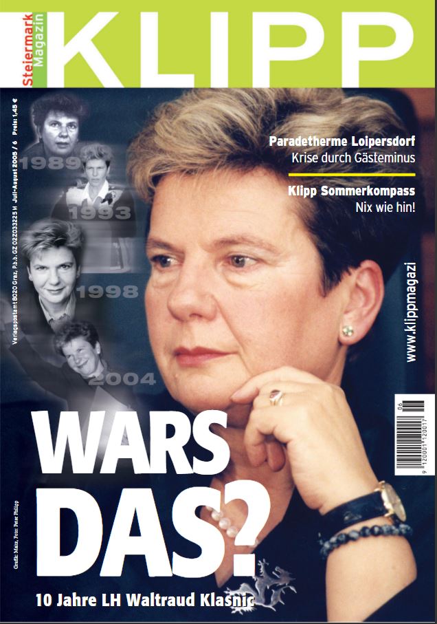 Doch Klasnic kennt ihre Grenzen und winkt sofort ab. Der Triumph bei der Wahl 2001 gibt ihr im Nachhinein Recht. Doch nur vier Jahre später stürzt sie ab und musste in die Polit-Pension. Auslöser waren ÖVP-interne Konflikte zwischen ihr und dem damaligen Landesrat Gerhard Hirschmann. Aber nicht zuletzt auch eine einsame Entscheidung während der regierungssitzungsfreien Zeit im Sommer. Klasnic hatte damals eine Millionen-Förderung (noch in Schilling) an die Familie Herberstein und deren Schloss-Umbau bewilligt. KLIPP titelte in seiner letzten Ausgabe vor der Landtagswahl: „War’s das?“