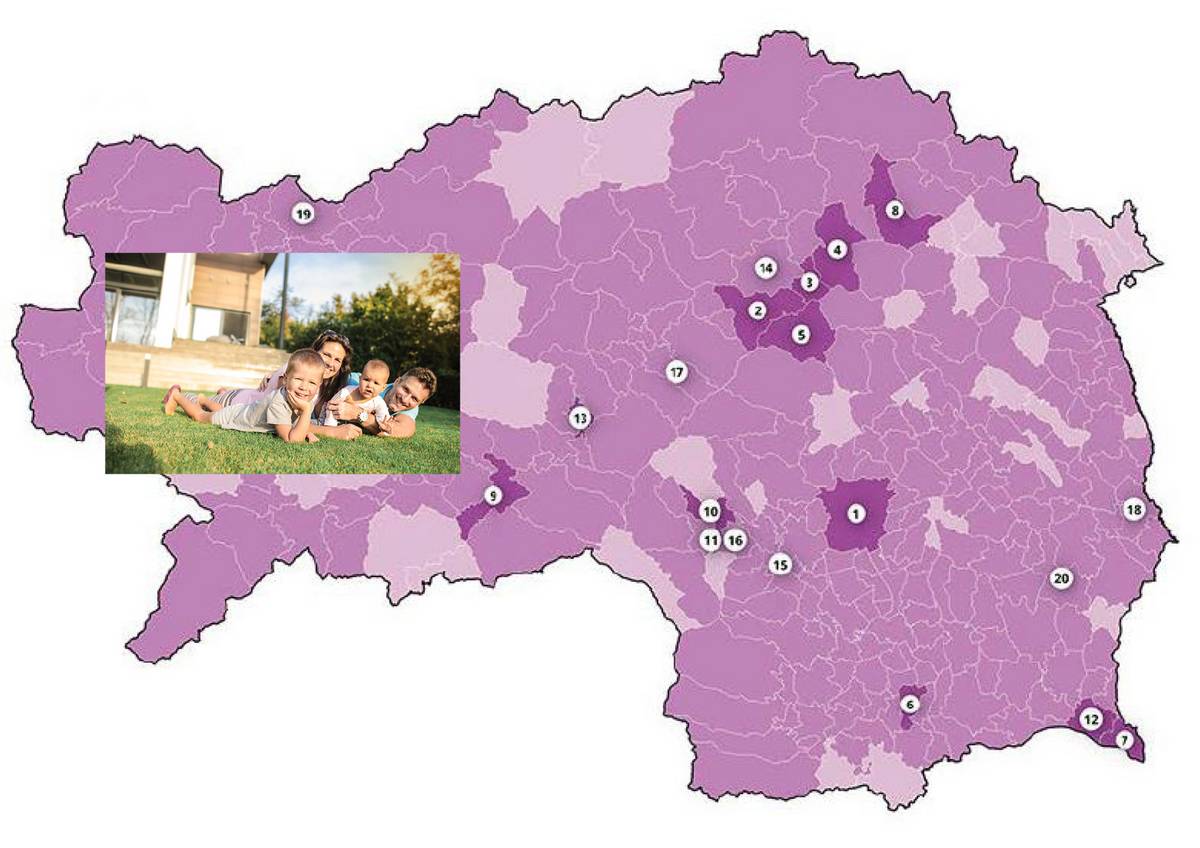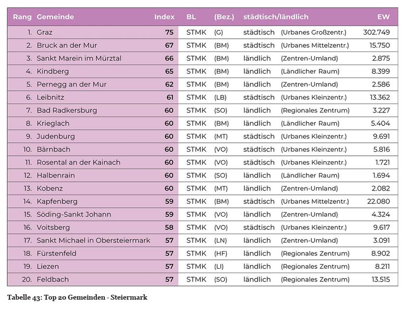 Die Spannweite der Indexwerte zwischen der erstplatzierten Gemeinde und den Gemeinden auf hinteren Plätzen ist vergleichsweise breit. Logischerweise an der Spitze liegt mit deutlichem Abstand die Landeshauptstadt Graz – mit 75 von möglichen 100 Indexpunkten. Auffällig ist, wie in anderen Bundesländern auch, dass unter den Top 20 acht städtische und zwölf ländliche Gemeinden gelistet sind. Das ist nicht zuletzt auf die regionalen Cluster von Gemeinden zurückzuführen. Diese sind in der Steiermark weniger ausgeprägt als in anderen Bundesländern.