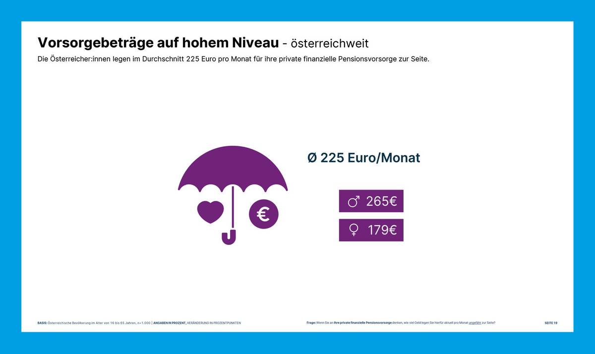 Der durchschnittliche monatliche Vorsorgebetrag liegt österreichweit mit 225 Euro weiterhin auf einem hohen Niveau. Männer investieren durchschnittlich 265 Euro pro Monat, Frauen 179 Euro.