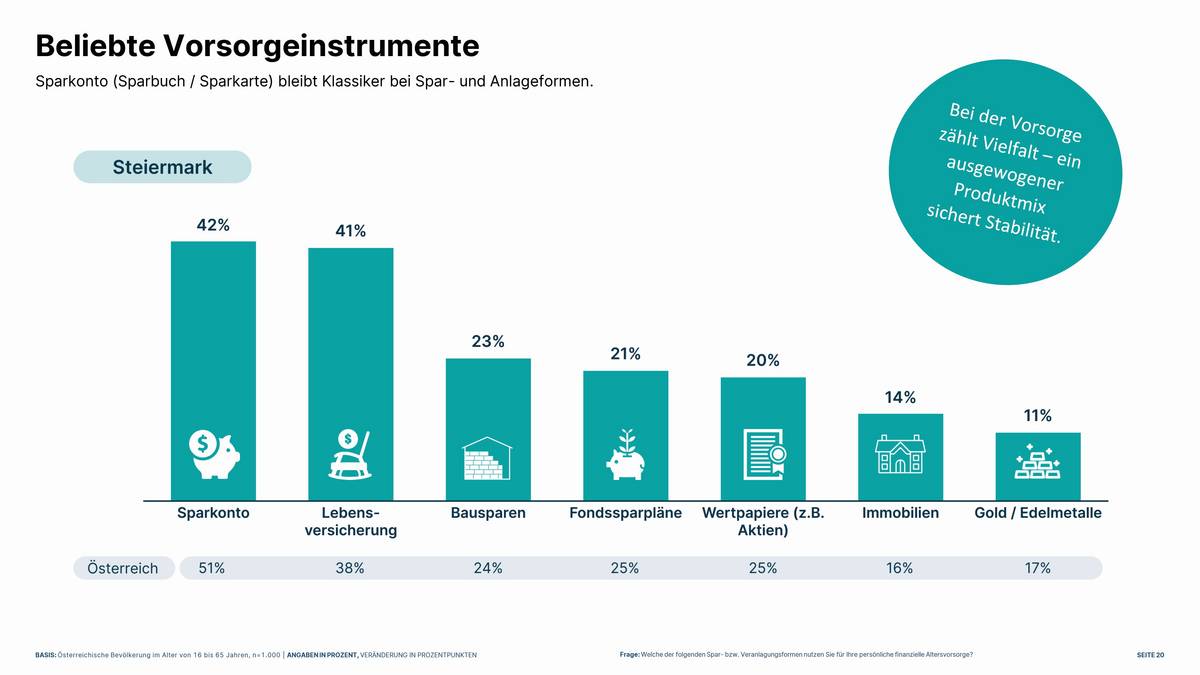 Fragt man die Menschen im Bundesland nach den bereits genutzten Vorsorgeinstrumenten, werden die Anlage-Klassiker genannt: Sparkonto (42 %), Lebensversicherung (41 %) und das Bausparen (23 %). Es folgen Fondssparpläne und Wertpapiere (21 % bzw. 20 %), Immobilien (14 %) und Gold (11 %). Auffallend dabei ist, dass erstmals seit Jahren in der Steiermark das Sparkonto (-17PP) weniger stark nachgefragt ist – die Lebensversicherungen (+6PP) hingegen an Beliebtheit zulegen konnte.