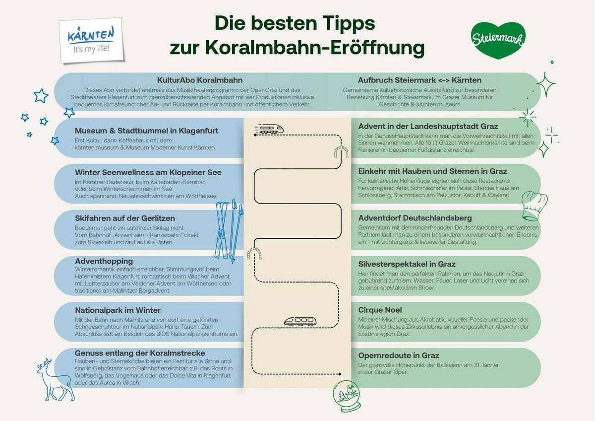 Davon, dass die Koralmbahn weit mehr als eine neue Verbindung ist und den Besuchern völlig neue Möglichkeiten auf beiden Seiten des Tunnels eröffnet, ist auch Klaus Ehrenbrandtner, Geschäftsführer der Kärnten Werbung, überzeugt. „Bequem mit der Bahn z.B. direkt auf die Skipiste zu gelangen oder unsere Adventmärkte zu besuchen, spricht sowohl Tages- als auch Nächtigungsgäste an. Hier sehen wir ein Potenzial von über 600.000 Gästen allein im Großraum Graz. Diese sowie internationale Gäste wollen wir zudem mit neuen, attraktiven und klimafreundlich erreichbaren Angeboten, auch in der Vor- und Nachsaison, gezielt ansprechen.“