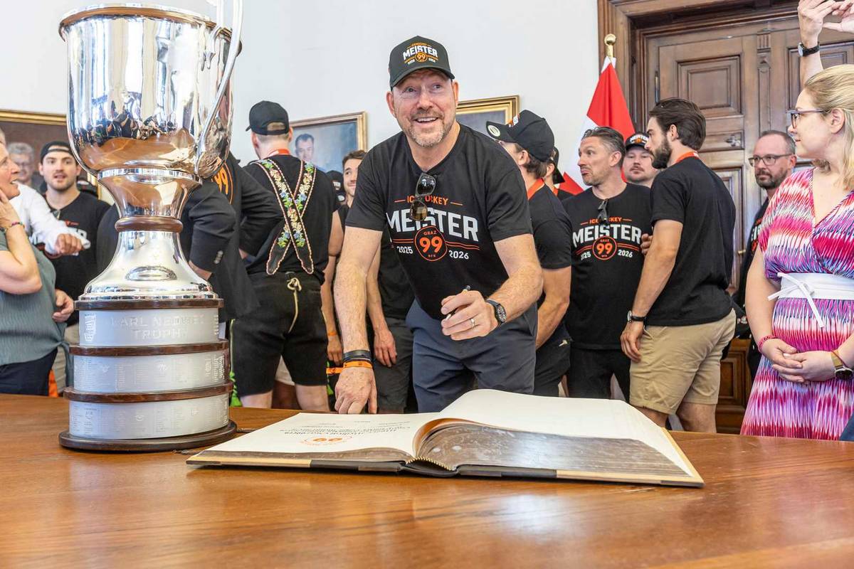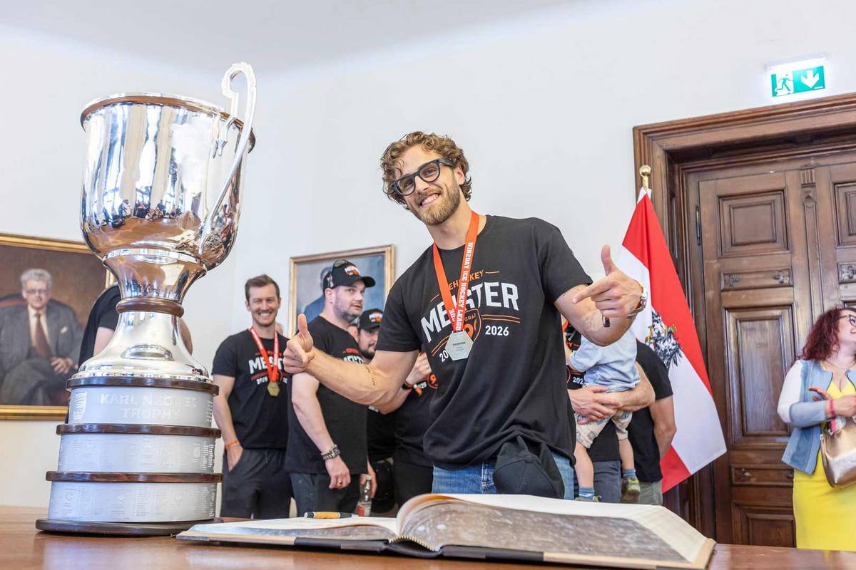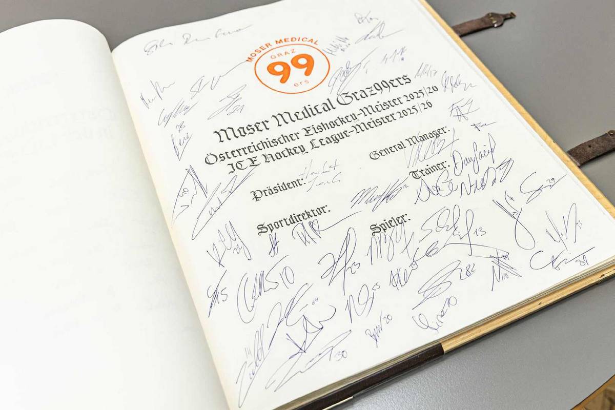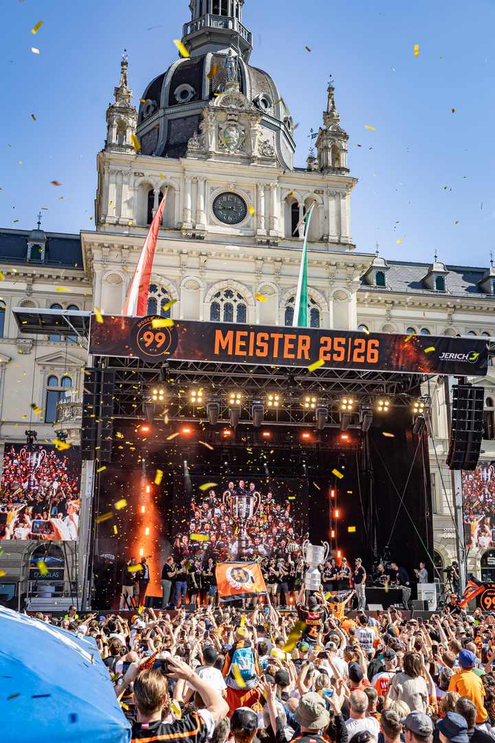 Im Zeichen eines Meilensteins in der Vereinsgeschichte wurde Graz am vergangenen Sonntag (26.4.) zur Bühne für die Moser Medical Graz 99ers: Nach dem erstmaligen Gewinn des Meistertitels in der ICE Hockey League sowie der österreichischen Eishockey-Meisterschaft wurde das Team feierlich im Rathaus empfangen und trug sich in das Goldene Buch der Stadt Graz ein. Höhepunkt: Die anschließende Meisterfeier mit hunderten Fans am Hauptplatz.