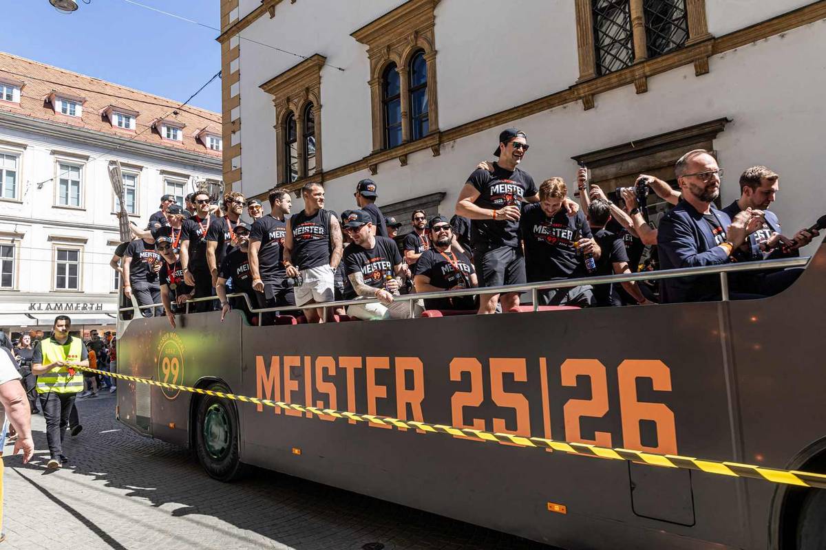 Allen voran freute sich Bürgermeisterin Elke Kahr, die selbst großer Eishockeyfan ist: „Wir sind wahnsinnig stolz, dass ihr diesen Titel nach Graz geholt habt!“
