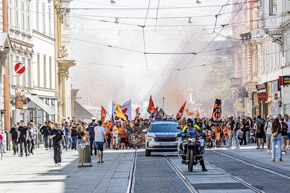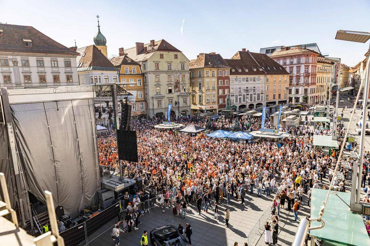 Ein Meer aus Orange tauchte den Hauptplatz in festliche Farben, als im Anschluss an die Eintragung ins Goldene Buch rund 7.000 Fans ihre 99ers feierten: mit großer Bühne, Feuershow und Promi-Fan Andreas Gabalier. Nach Gert Steinbäckers „Steiermark“ stimmte er sein „Hulapalu“ an, wo dann alle einstimmten bei: „Hodi odi ohh di ho di eh, Hodi odi ohh di ho di eh ...“