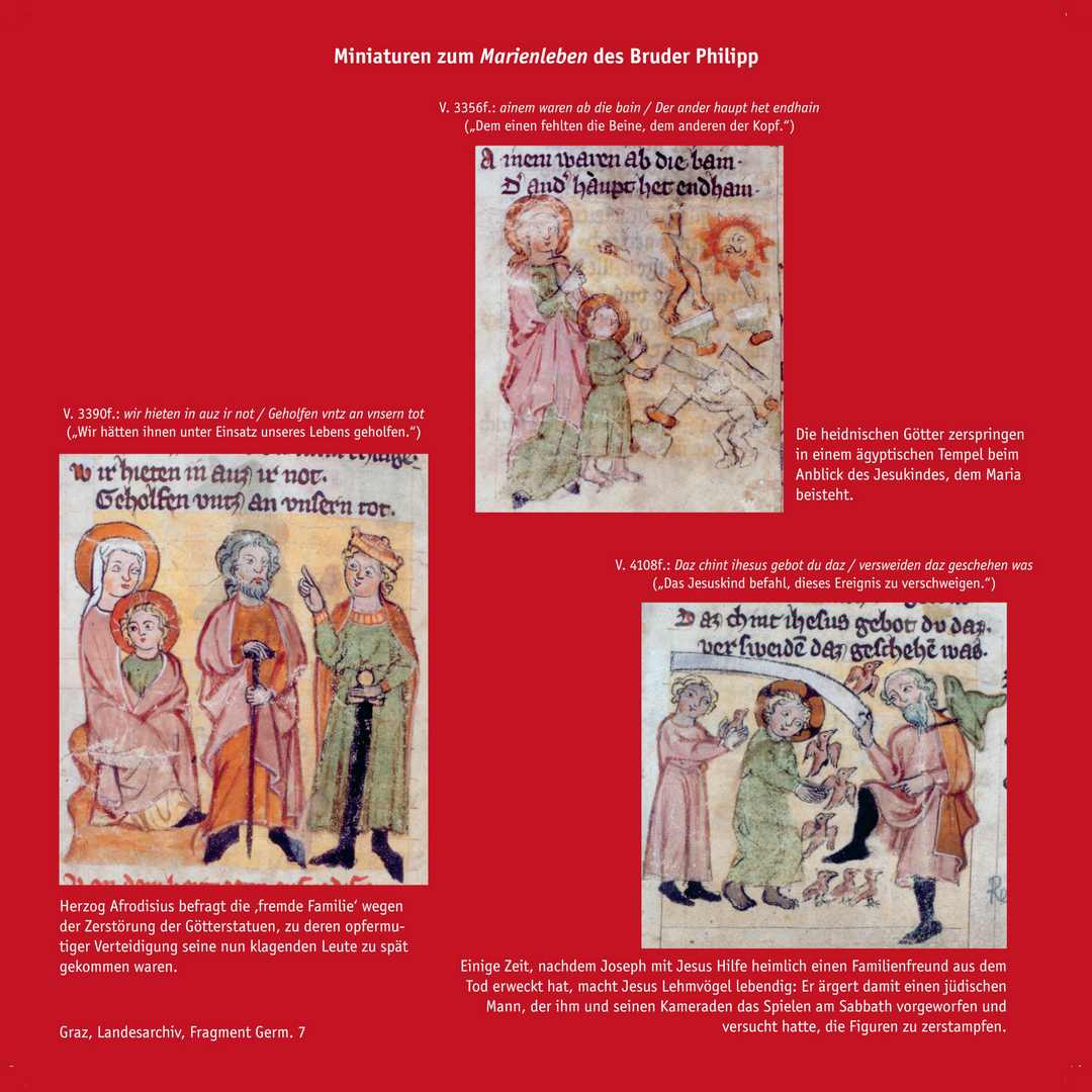 Der Komponist vertonte aus der umfangreichen Dichtung (mehr als 10.000 Verse) vor allem Abschnitte, in denen die liebevolle Beziehung zwischen der Mutter Maria und ihrem Sohn Jesus geschildert wird. Dargestellt in ausgewählten Szenen von der Geburt in Bethlehem über prägende Stationen seines Lebens bis hin zu Kreuzigung, Auferstehung und der Aufnahme Mariens in den Himmel.