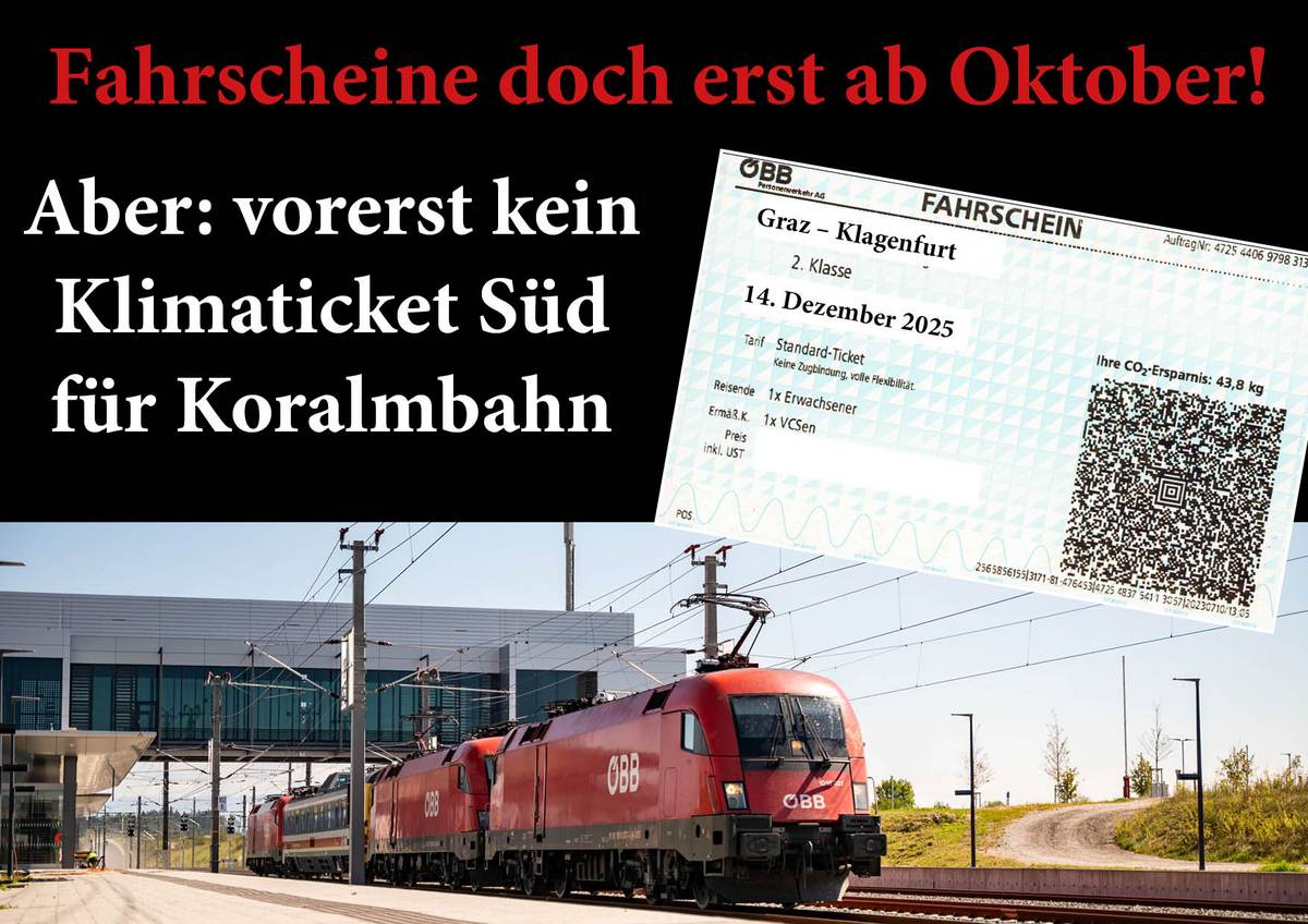 Es sei alles der großen Dimension des Projektes geschuldet, dass der ursprüngliche Plan der ÖBB, bereits ab kommenden Dienstag das Ticketing für die Koralmbahn starten zu können, nicht hält. Das wäre sich technisch nicht ausgegangen, so Sprecherin Zernatto-Peschel. Und so werden am 16. September „nur“ die zentralen Fahrplan-Neuerungen bekannt gegeben und eben nicht die Ticketpreise und dergleichen. Das werde noch bis Mitte Oktober dauern, heißt es.